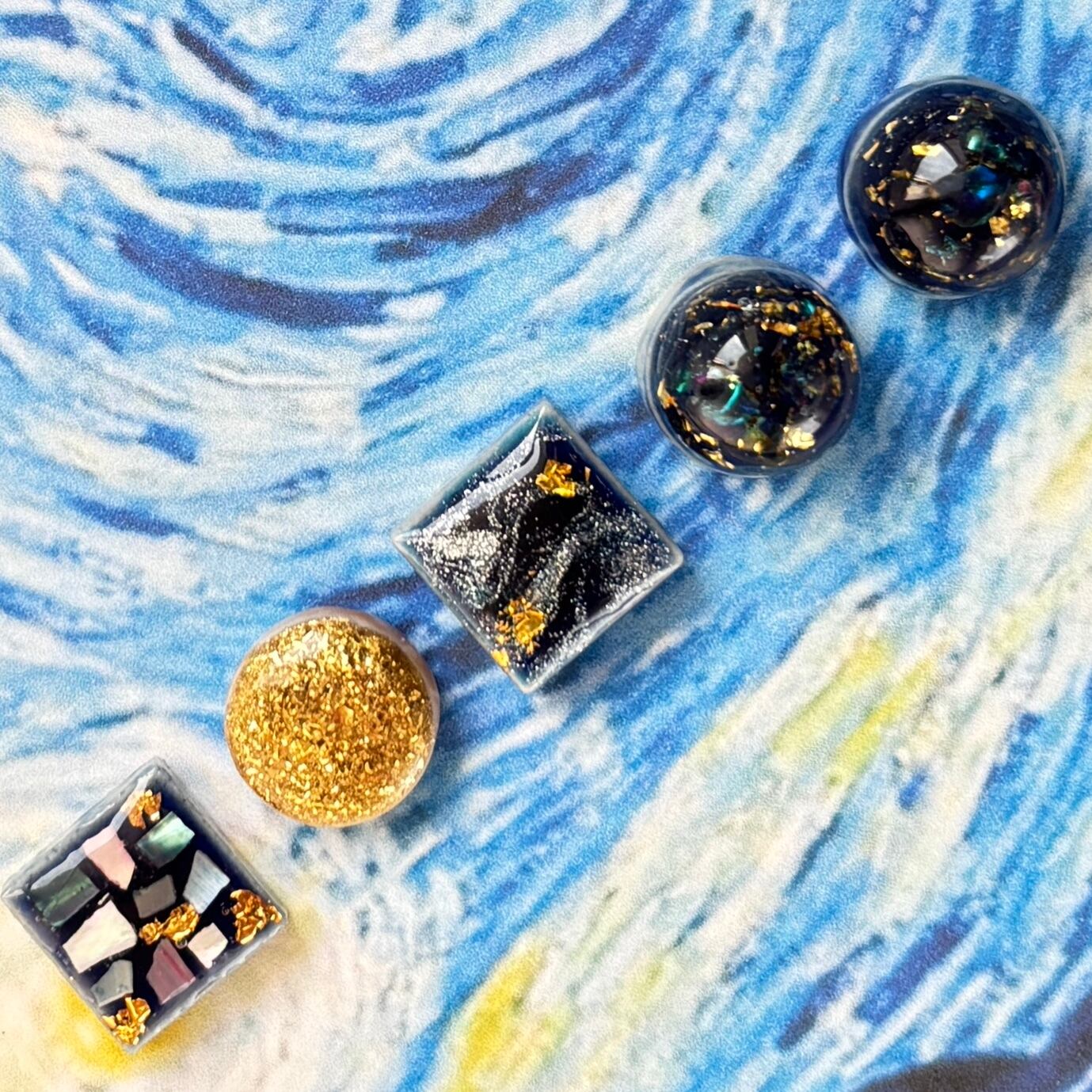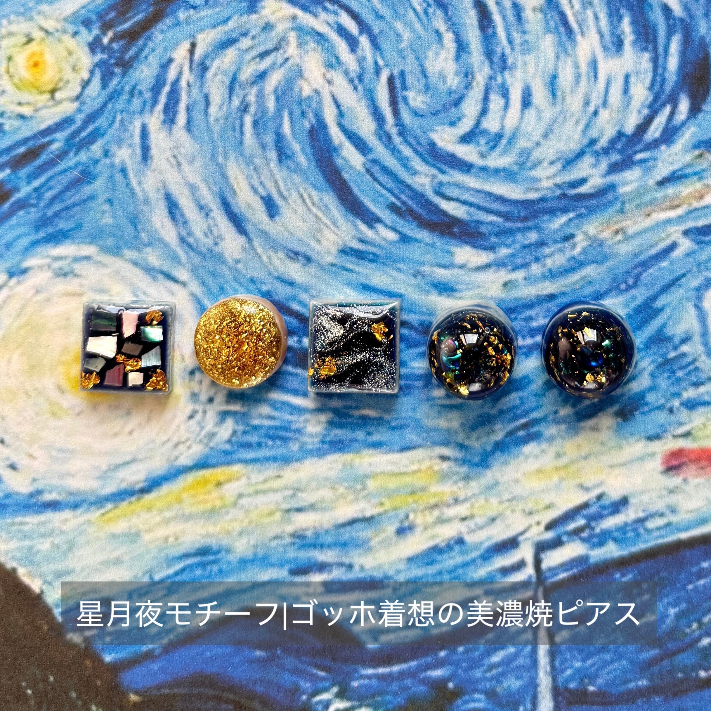 ゴッホの名画『星月夜』をイメージした美濃焼セラミックピアス5点セットです。美濃焼の陶器土台に、レジンで封じ込めた琉球ガラスや螺鈿が輝き、夜空にきらめく星々を表現しました。透明感のあるレジン層が光の角度で美しく変化します。