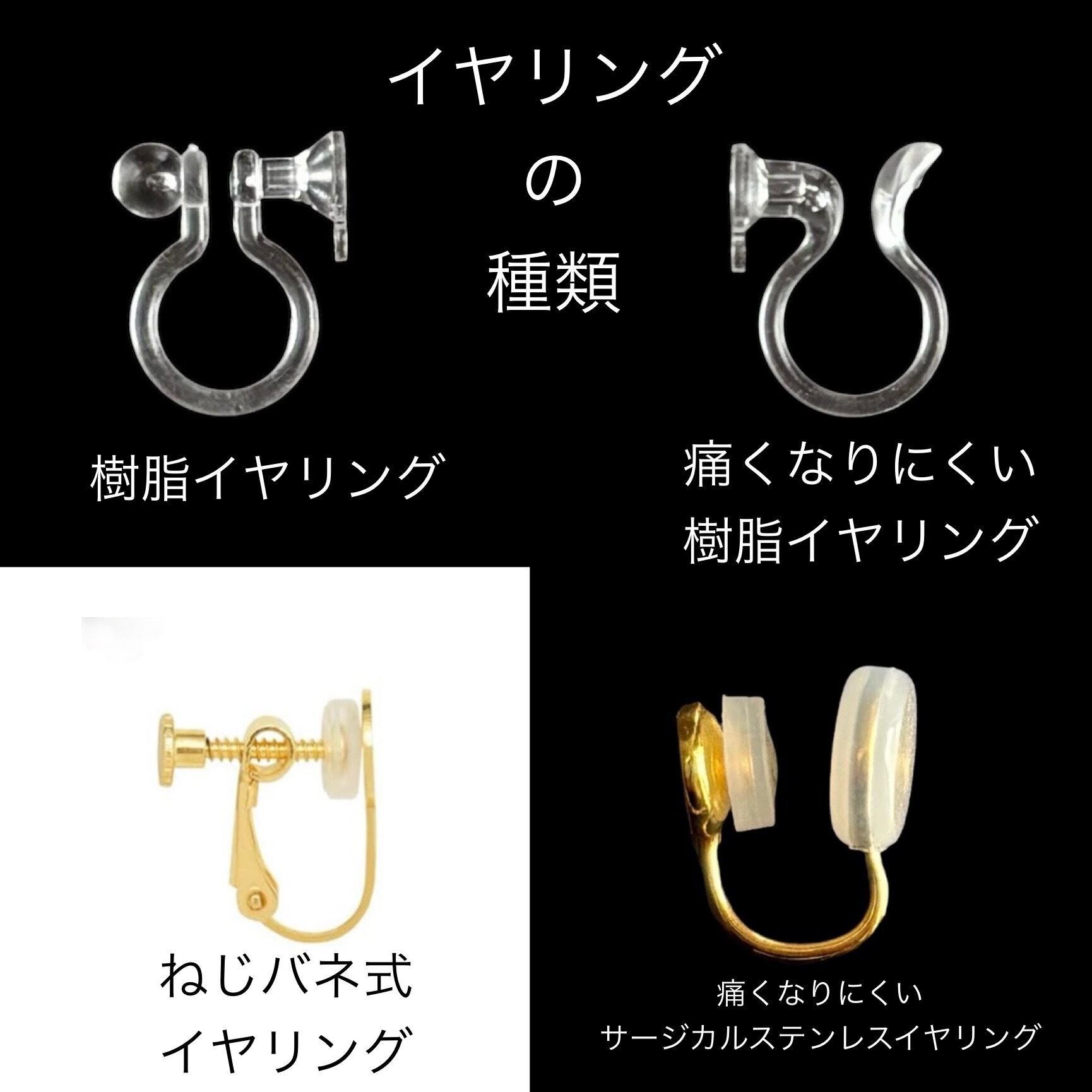4種類のイヤリング(樹脂イヤリング、痛くなりにくい樹脂イヤリング、ねじバネ式イヤリング、痛くなりにくいサージカルステンレスイヤリング)へのご変更も可能です。