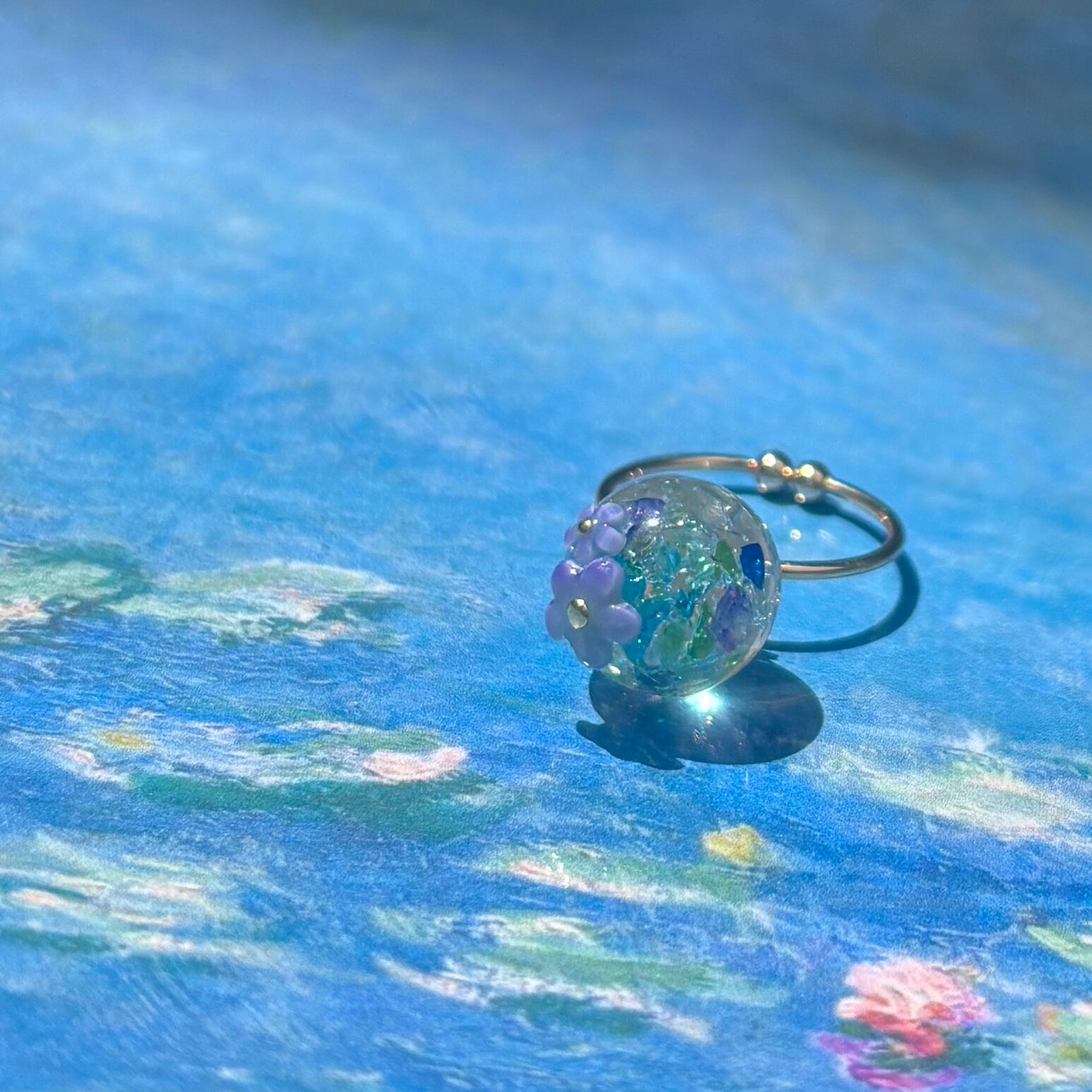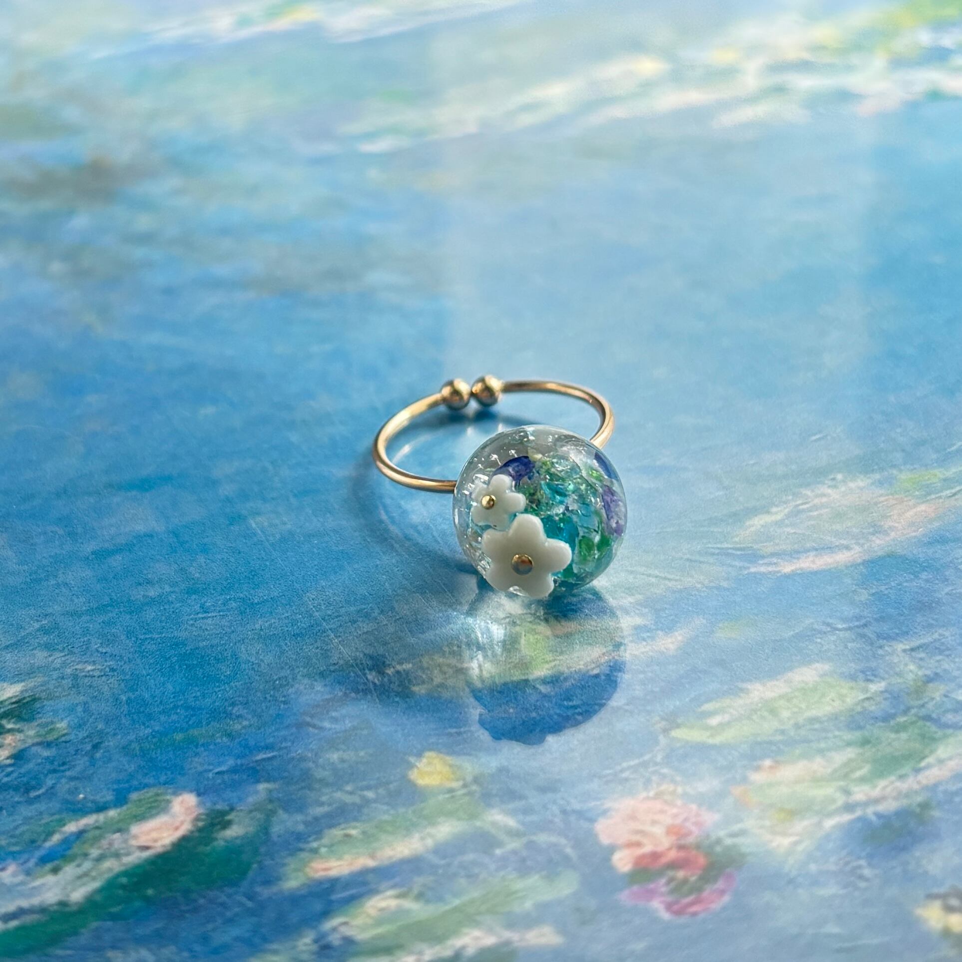 モネの代表作『睡蓮』から着想を得た、透明感のあるレジンリングです。