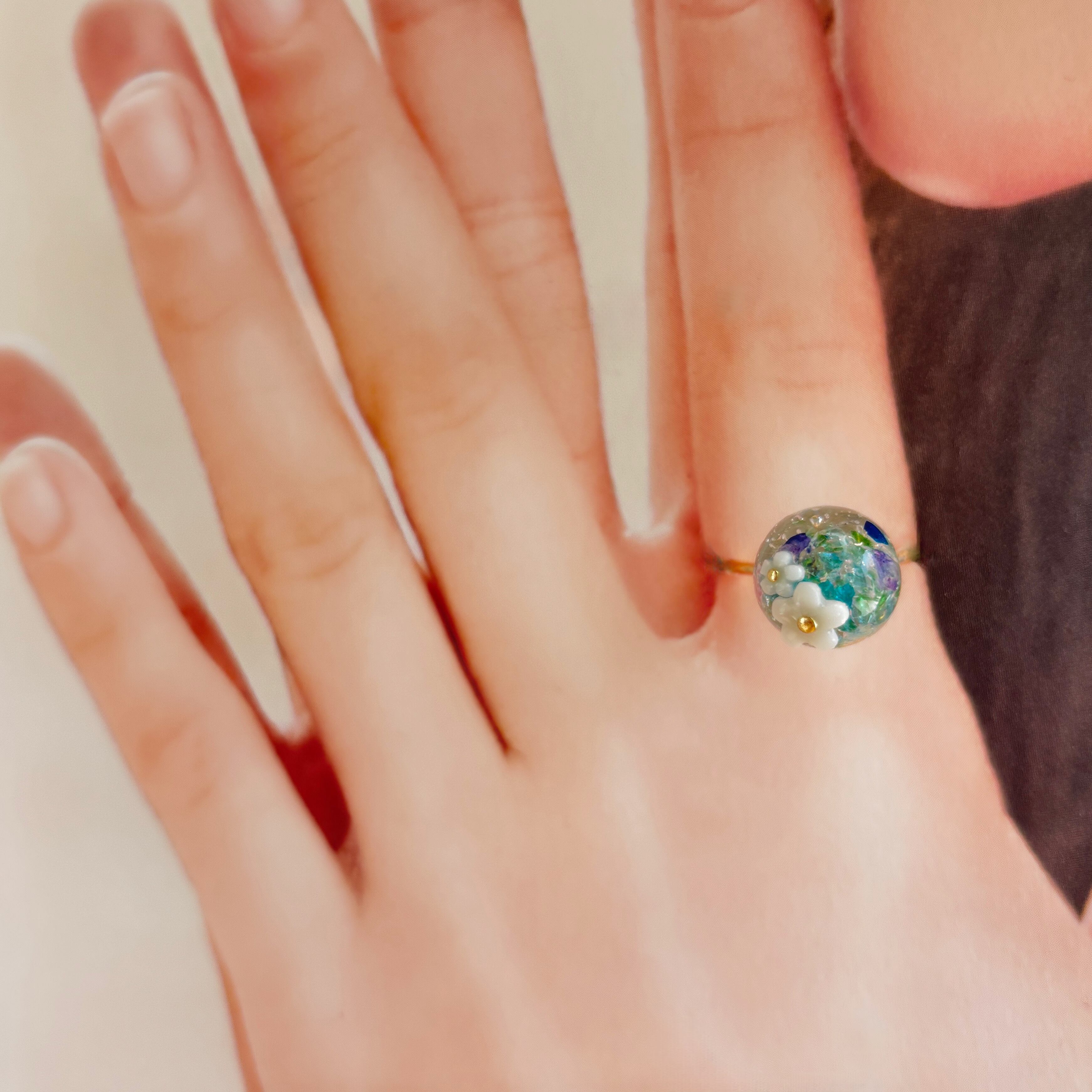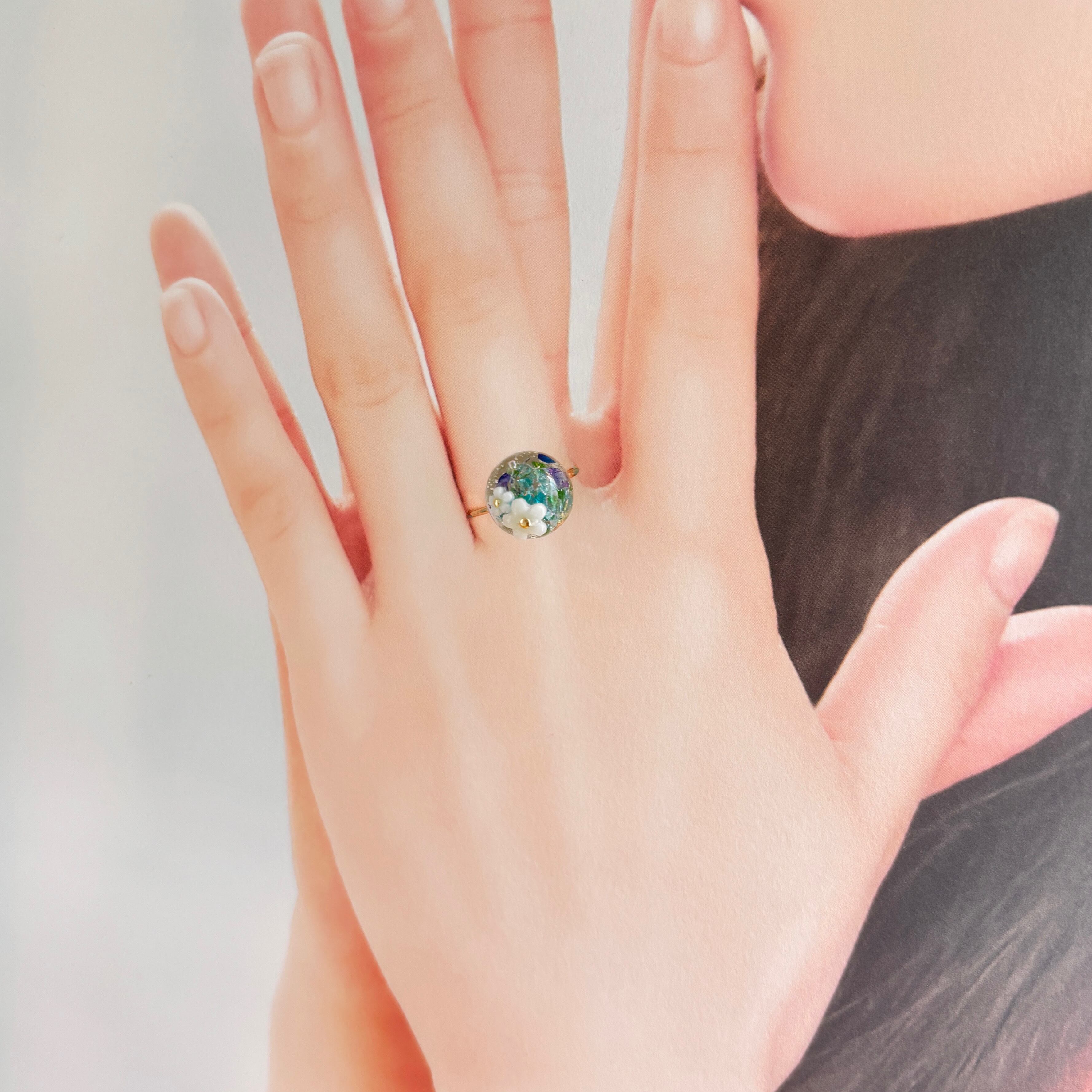 モネ 睡蓮 レジンリング ハンドメイドアクセサリー サージカルステンレス指輪 ガラス封入 球体リング 紫外線で色が変わる 色変化アートリング 金属アレルギー対応 プレゼント ギフト 人気 手作り